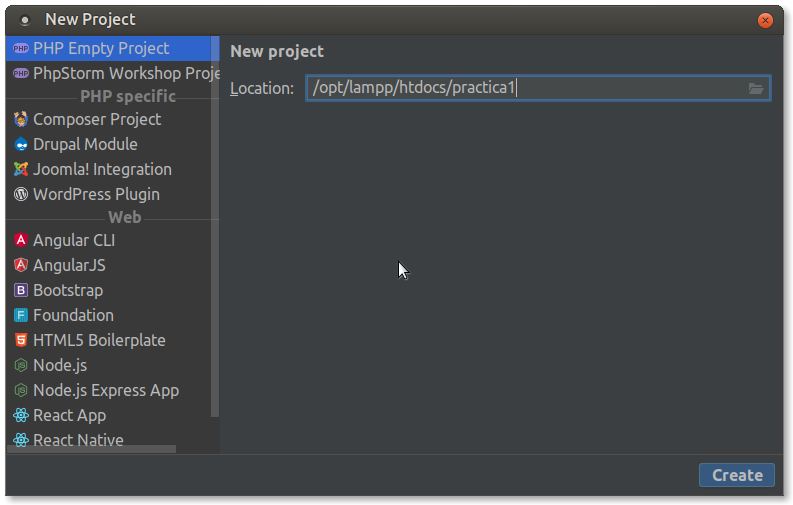 PHPStorm anem a crear el nostre primer projecte PHP buit.
